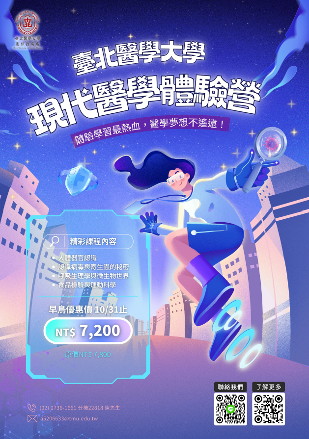 三、課程詳細內容洽本校進修推廣處官網https://cee.tmu. edu.tw/ ,本校醫學營承辦人:陳專員 聯絡電話:02-