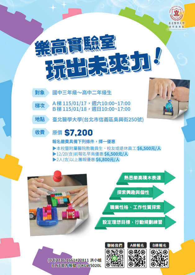 一、本校為鼓勵國中學子於寒假期間參與多元學習,將於115年 1月17日至2月5日辦理【全國青少年國中寒假營隊】系列課 程。課程由本校師資與附屬醫院醫師親自授課,結合理論 與實作,並由學長姐陪伴,引導學生探索醫學領域、拓展 視野。
