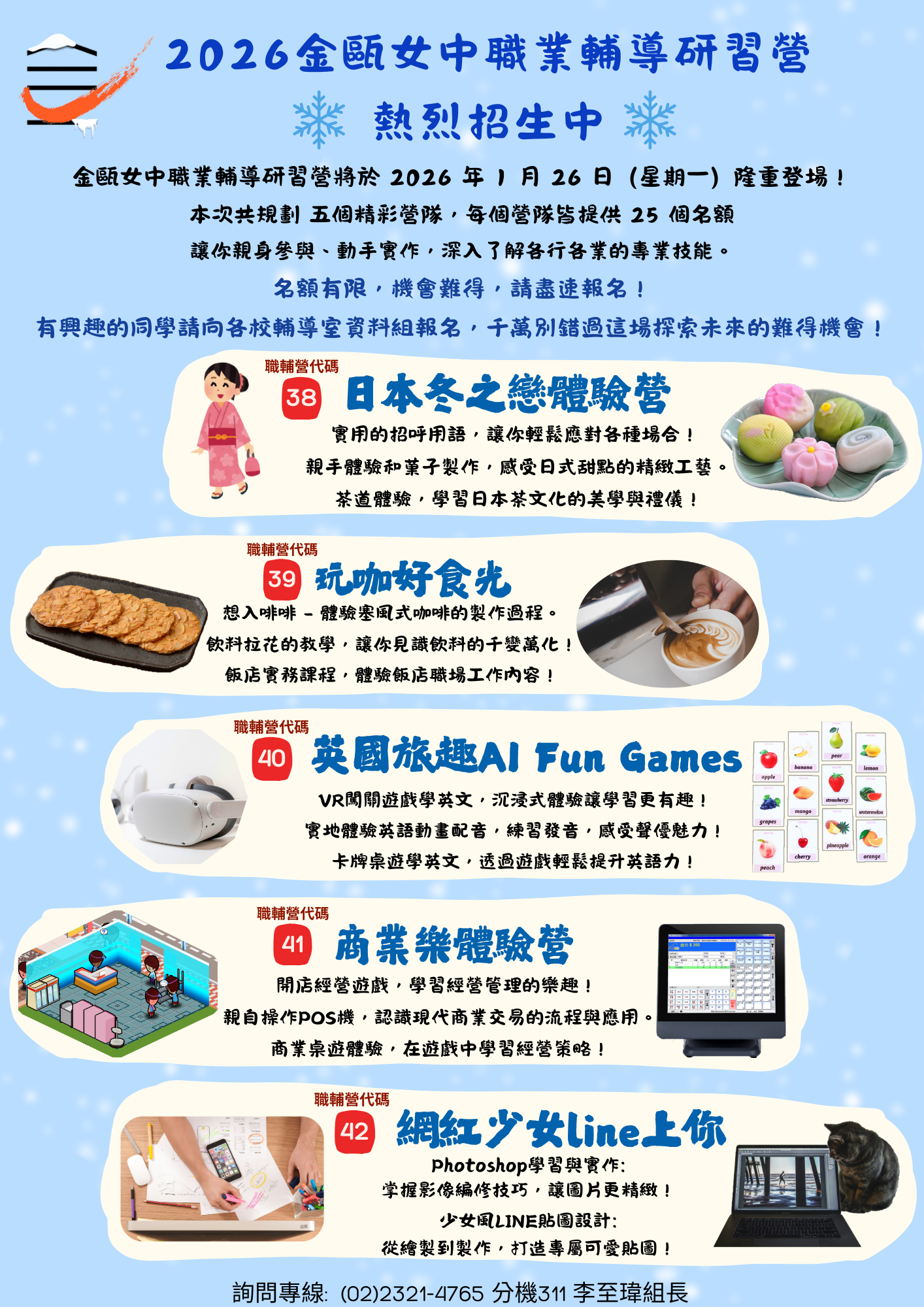 一、本校定於民國115年1月26日(一)於本校辦理【台北市國中生職業輔導研習營】活動,歡迎貴校同學報名參加。