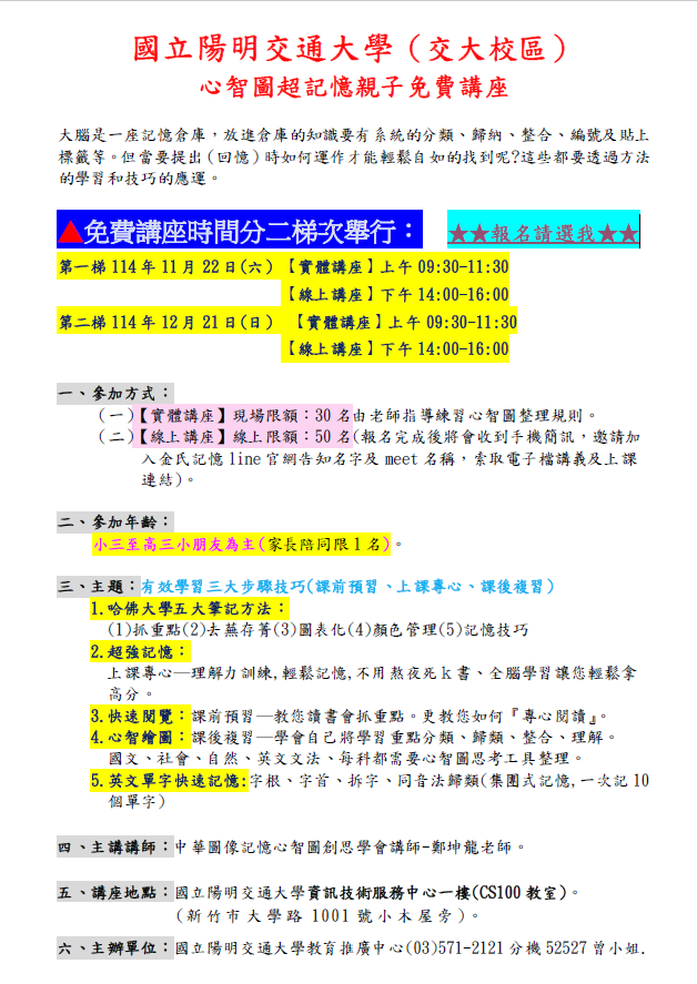 六、聯絡窗口請洽本校推廣教育中心曾小姐,專線:03- 5724045,電子信箱:molisa@nycu.edu.tw 。
