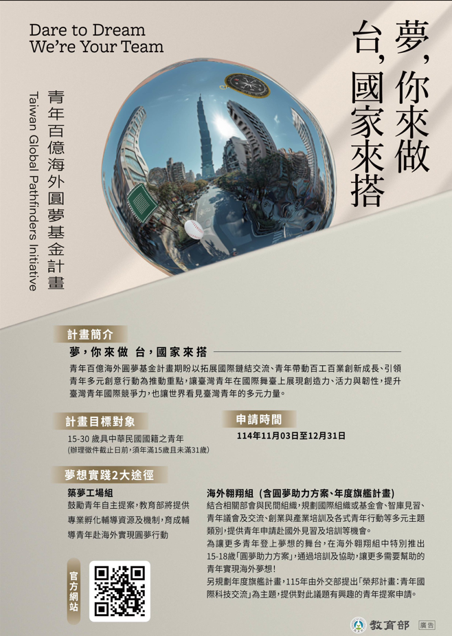 三、本計畫對象為本國15至30歲青年,分為築夢工場組與海外 翱翔組(含年度旗艦計畫),第1梯次報名即日起至12月31 日,相關資訊可上計畫平臺查詢(https://twpathfinder. org/)