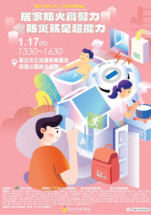 1月17日星期六下午,臺北市119防災宣導活動在科教館及兒童新樂園,有親子闖關、消防體驗與表演!居家防火齊努力,防災就是超能力!